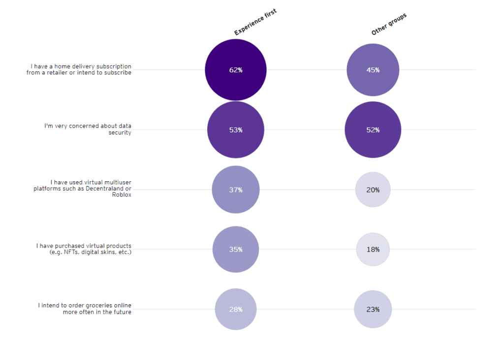 Experience first” consumers are embracing digital technologies more than other tribes. Over a third have purchased virtual products such as digital skins or interacted using virtual multiuser platforms such as Roblox. Almost half of them have bought an item directly from social media.