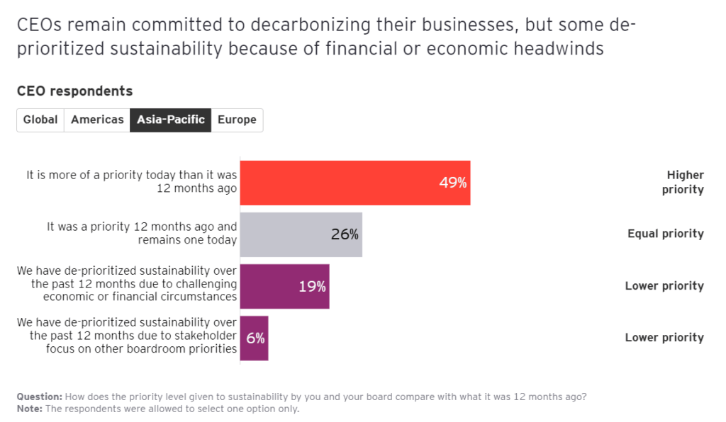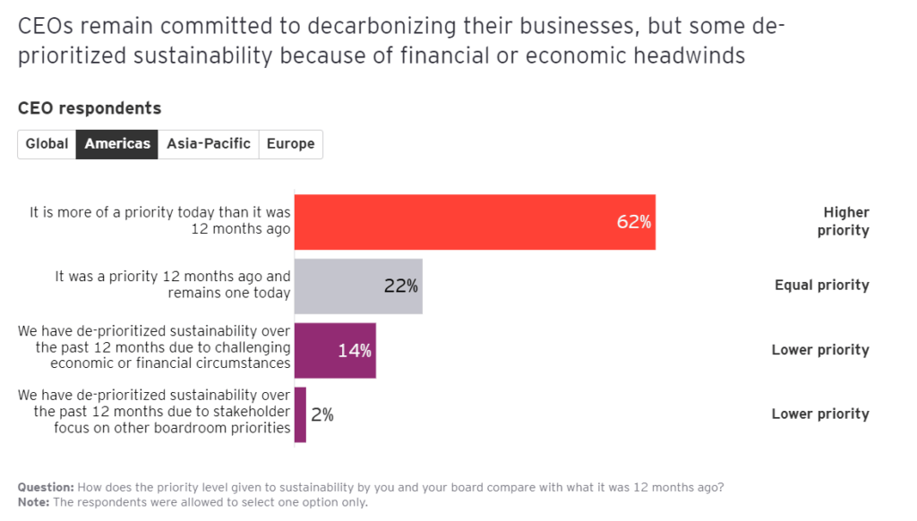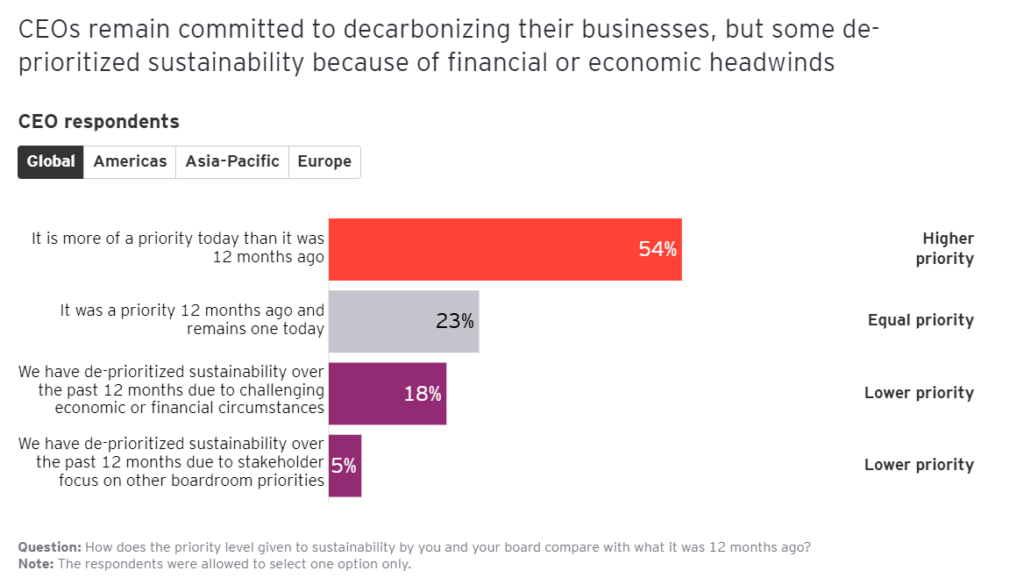 In that context, most CEOs remain committed to decarbonising their business to reach net zero, with over half (54%) of the global survey population saying it is a higher priority now than it was 12 months ago. However, a quarter have de-prioritised sustainability, mainly in the face of short-term financial or economic headwinds, which will be disappointing for those who look to companies to set the tone on this topic.