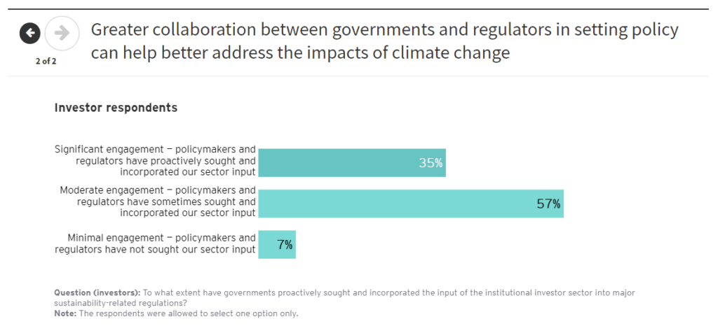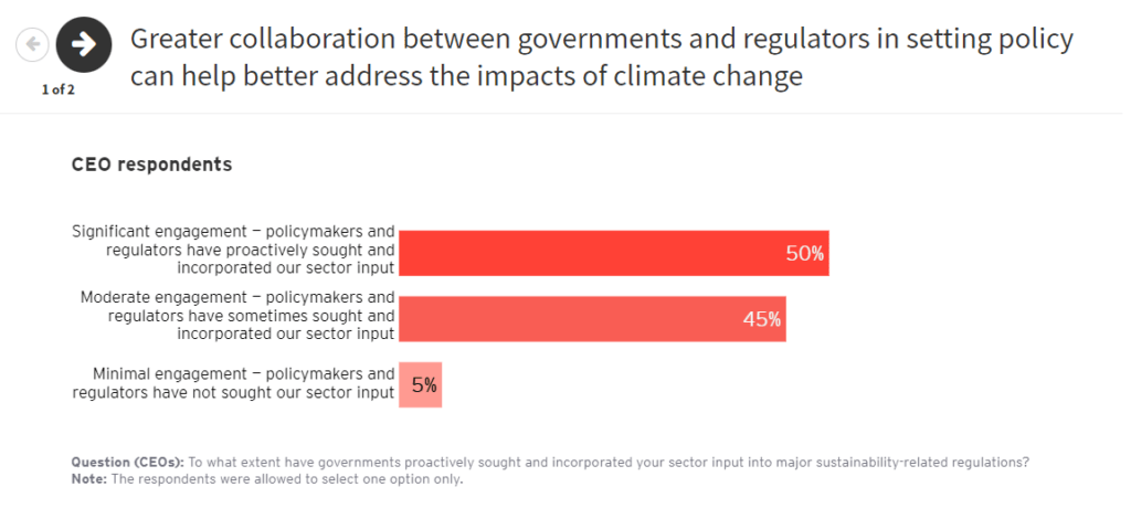 An interactive bar chart highlighting the extent to which governments have proactively sought and incorporated sector input into major sustainability-related regulations. Half of CEOs vs. a third of institutional investors reported significant engagement from policymakers.
