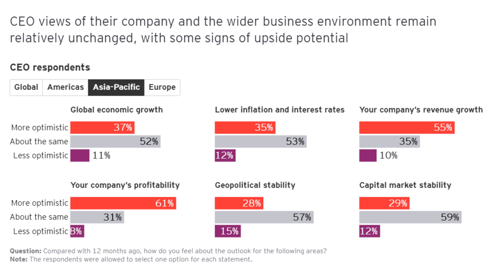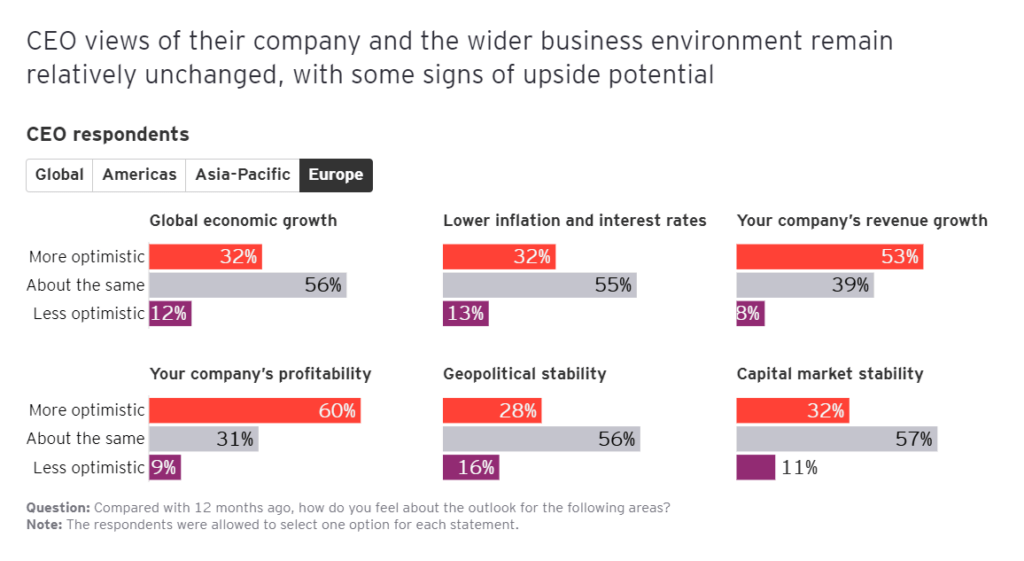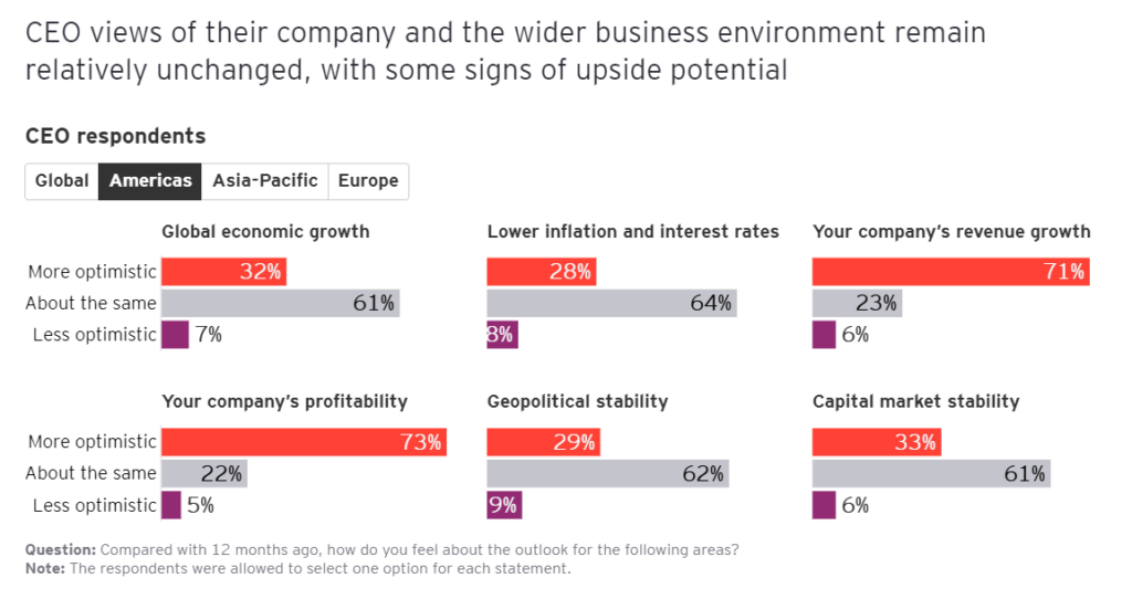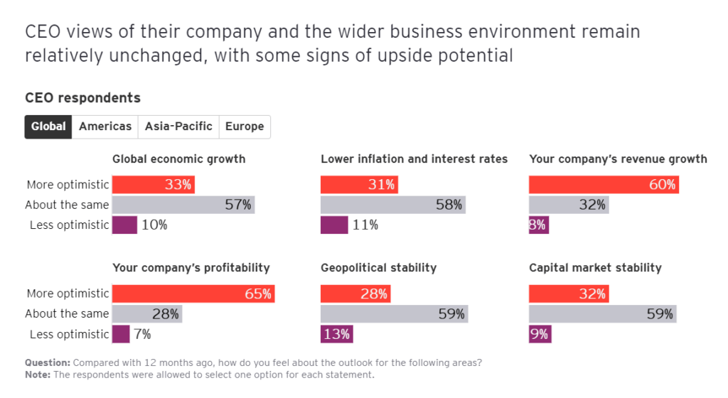 Six interactive bar charts presenting how global and regional CEOs feel about the rate of global economic growth, prospects for lower inflation and interest rates, company revenues, profitability, geopolitical stability and capital market stability.