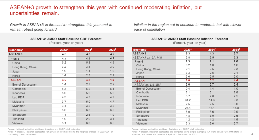 AMRO staff forecast growth in ASEAN+3 at 4.5 percent this year—from last year’s 4.3 percent—and 4.2 percent in 2025, with growth for ASEAN at 4.8 and 4.9 percent, respectively.