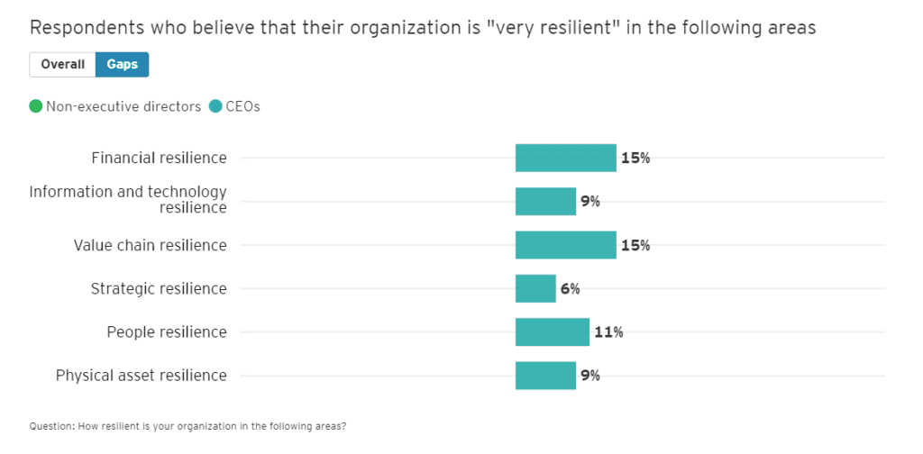 The data shows how CEOs and Non-executive Directors (NEDs) have divergent views on their organization’s level of resilience across six dimensions of enterprise resilience – financial resilience, information and technology resilience, value chain resilience, strategic resilience, people resilience, and physical asset resilience.